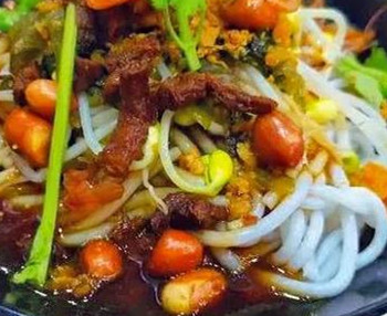 在粗粉中加進(jìn)滾熱的肉湯,撒上少許蔥花、爆花生米等,喜歡海鮮口味的,還會(huì)加蝦肉和海白。