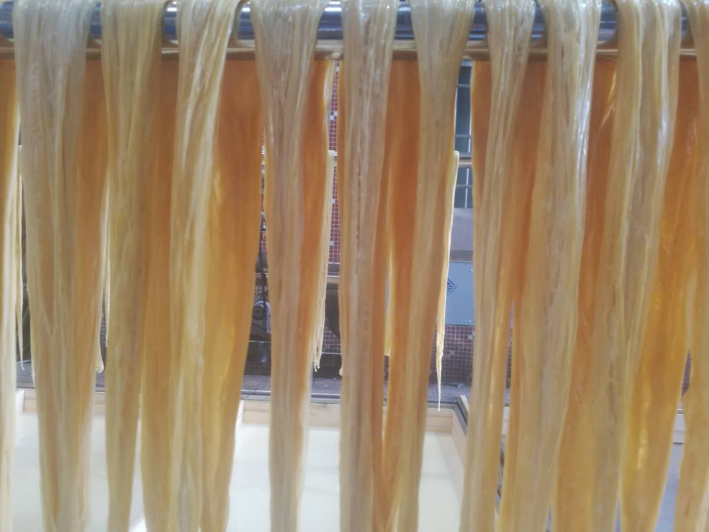 “一洗豆、二浸豆、三打漿、四隔渣、五擰漿、六煮漿、七鏟邊、八提膜、九掛灶、十曬晾”,遵照傳統(tǒng)古法,盡可能手工制作,還原腐竹本味。豆?jié){煮沸時(shí),上層凝固的部分成條的挑起來(lái),晾干后就成了腐竹,用水泡開(kāi)后就可以拿來(lái)烹飪了,吃著又鮮又滑。現(xiàn)在的人多數(shù)是用腐竹機(jī)來(lái)半自動(dòng)化制作腐竹,效率高。